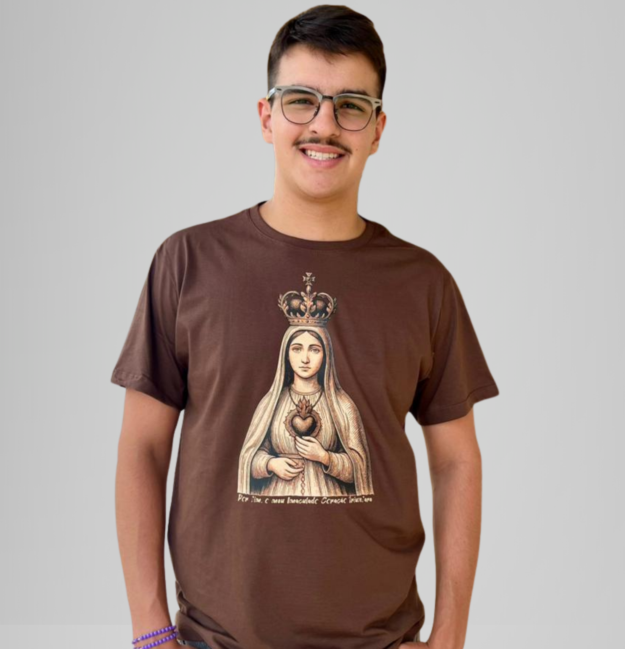 Leve consigo a promessa de esperança e a proteção da Virgem de Fátima. Esta camiseta exclusiva traz a poderosa frase revelada aos pastorinhos: "Por fim, o meu Imaculado Coração Triunfará