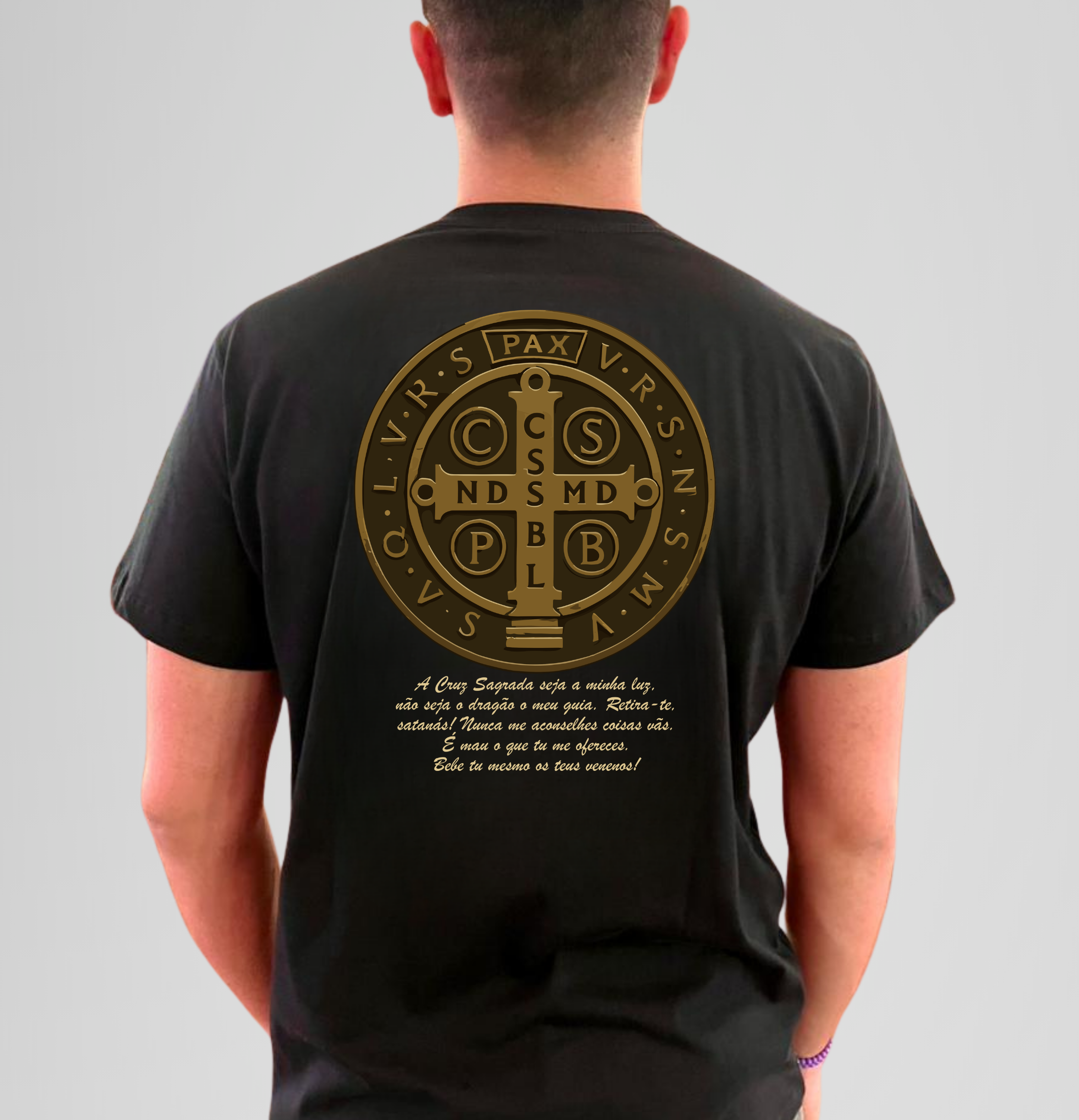 A estampa destaca a Medalha de São Bento, um dos sacramentais mais fortes da nossa fé, reconhecido por afastar o mal e proteger quem o usa com confiança e oração. Com a inscrição profética "Crux Sacra Sit Mihi Lux" (A Cruz Sagrada seja minha luz), esta peça serve como um lembrete diário para caminhar sob a luz de Cristo e resistir a todas as tentações. Ideal para quem busca um escudo espiritual aliado ao conforto e elegância.