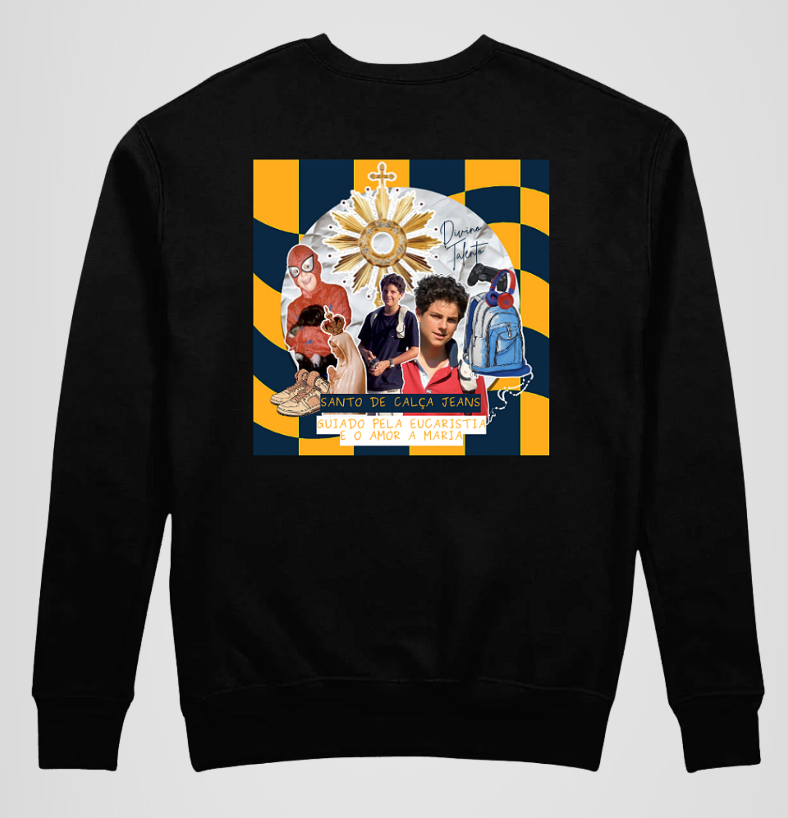 O moletom com estampa moderna de Carlo Acutis combina elementos que representam a vida e a fé desse jovem Beato: a Eucaristia, Nossa Senhora, o terço, além de itens que remetem ao seu cotidiano, como tênis, mochila e controle de videogame. Essa peça celebra a espiritualidade de Carlo e sua mensagem de que a santidade é para todos, independentemente da idade ou estilo de vida. Feita com materiais sustentáveis, é perfeita para quem busca inspiração em um exemplo contemporâneo de devoção e simplicidade
