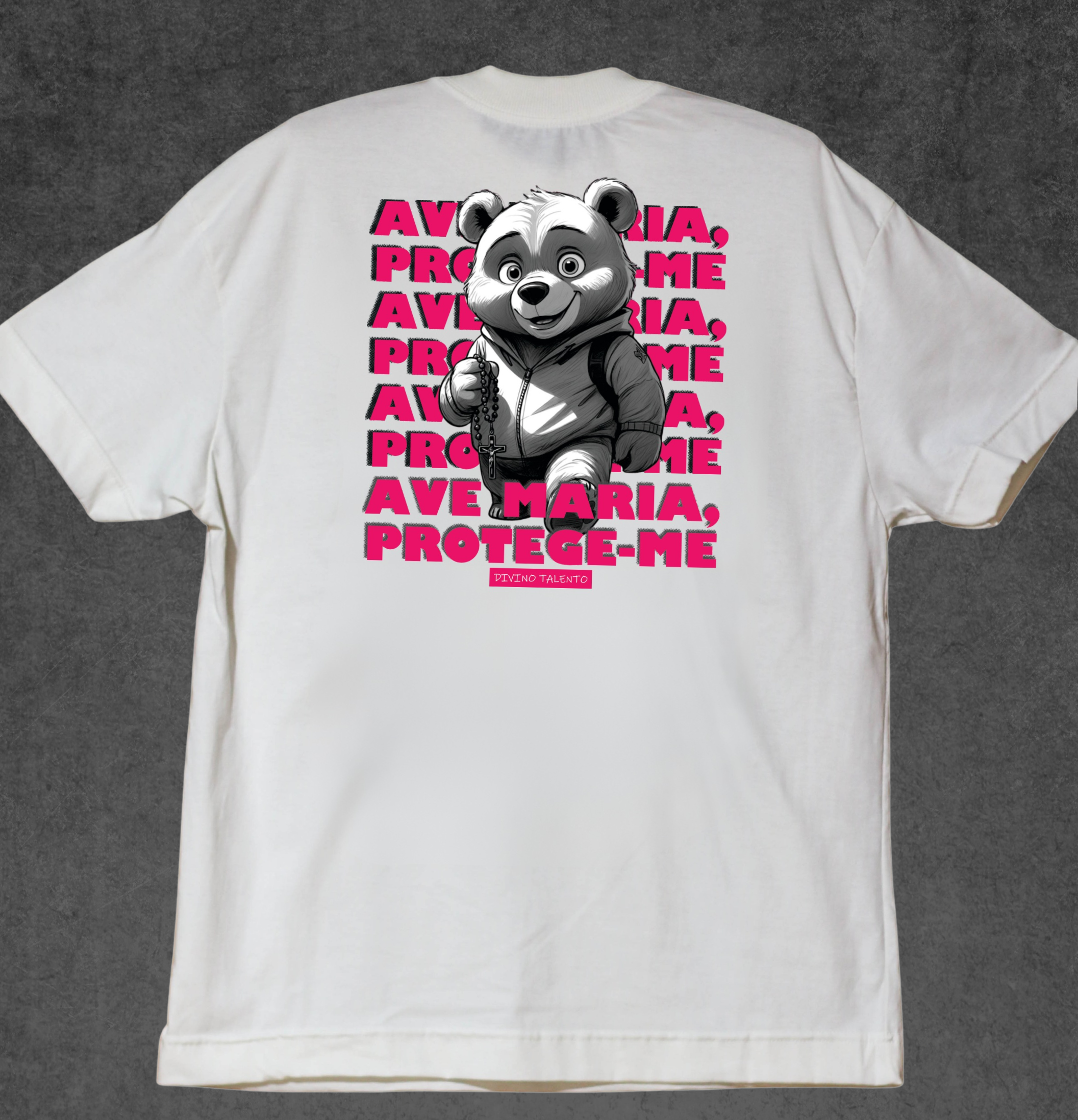 Nossa camiseta “Ave Maria” traz um urso carinhosamente ilustrado segurando o terço, lembrando-nos da força e da doçura da oração que atravessa séculos. Feita com tecido sustentável que reutiliza garrafas PET, ela une fé, cuidado com a criação e muito estilo.