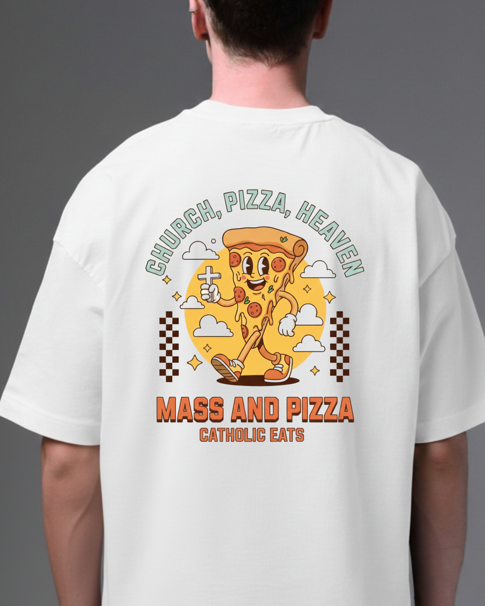 Quem disse que a vida de fé precisa ser sem graça? Nossa estampa celebra a alegria de ser católico, mostrando que a santidade combina perfeitamente com a diversão! É a prova de que dá para amar a Eucaristia no domingo e, ao mesmo tempo, ser fã número um da pizza de sábado à noite (ou pós-missa, por que não?)